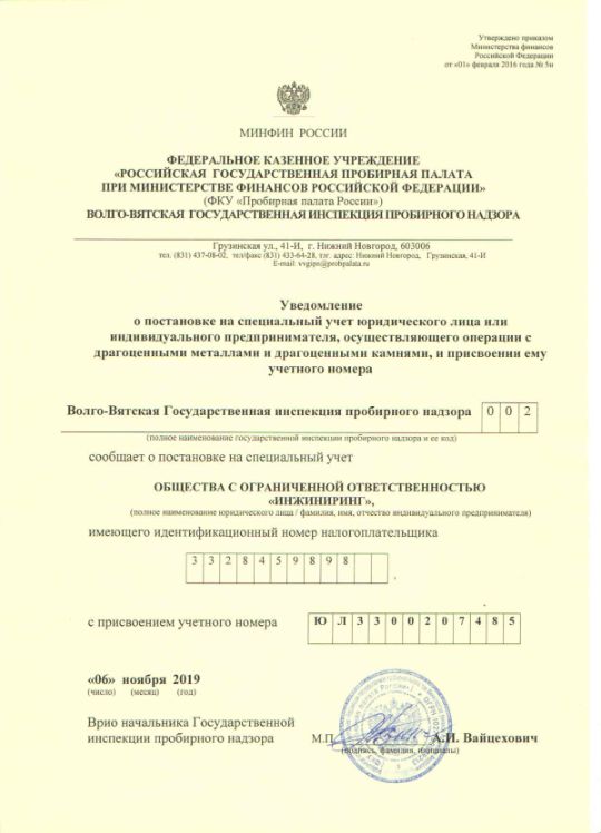 - уведомления о постановке на специальный учет Волго-Вятской Государственной инспекции пробирного надзора.